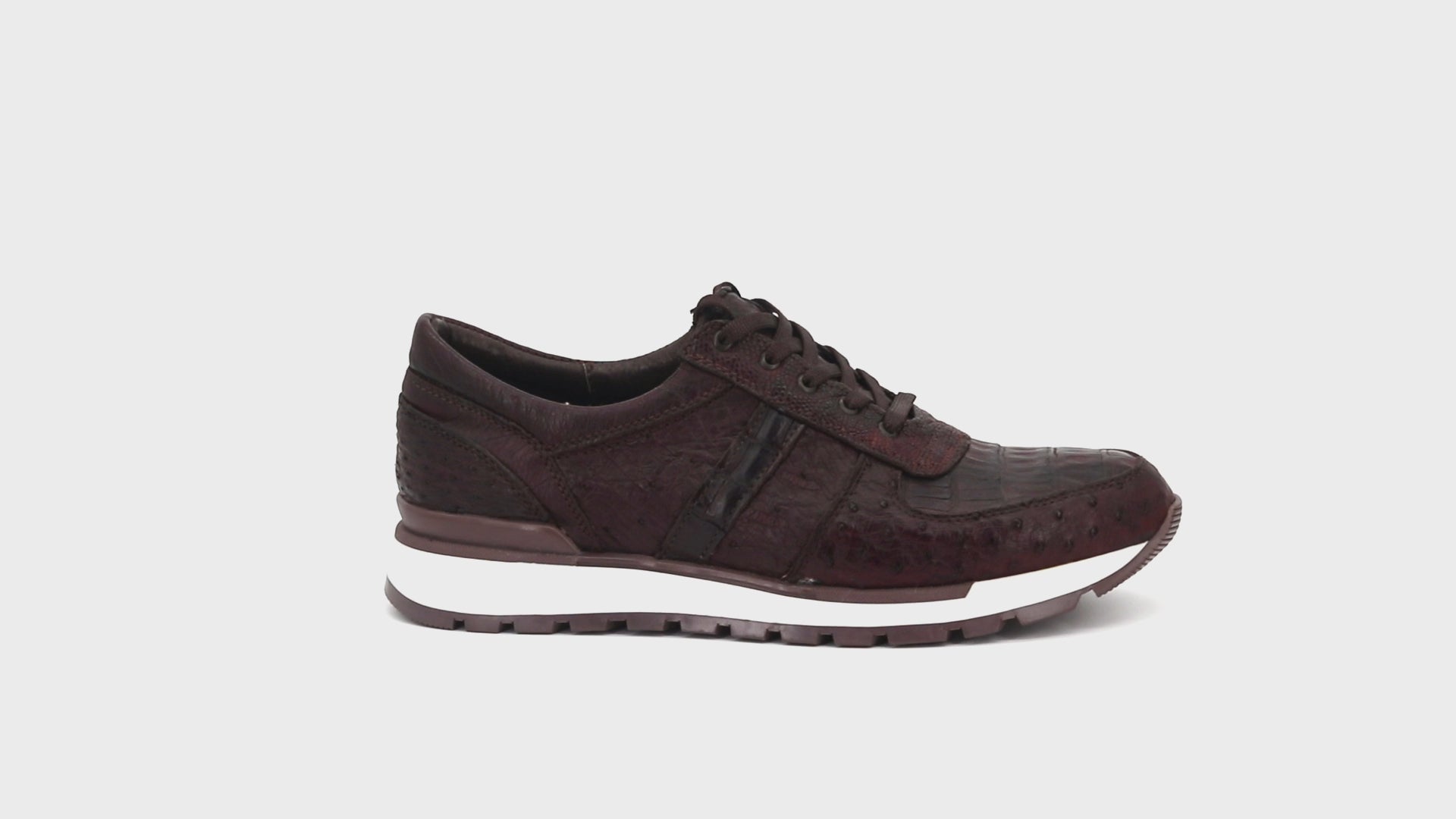 Blending bold texture with everyday comfort, these sneakers combine two of the most prized exotic leathers—crocodile belly and ostrich—for a look that’s as distinctive as it is refined. The crocodile belly panels showcase a symmetrical, high-gloss scale pattern, while ostrich leather adds soft, quilled contrast for added depth and flexibility. Designed with a classic lace-up front and set on a durable rubber sole, they offer excellent traction and all-day wearability. Inside, a breathable fabric lining enhances comfort and helps manage moisture, making these sneakers ideal for both elevated casual looks and special occasions. Modern, luxurious, and effortlessly stylish, they bring exotic craftsmanship to contemporary streetwear.