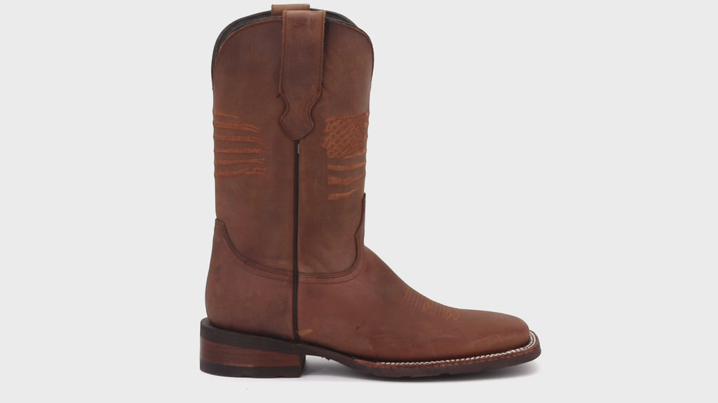 These men’s western boots blend classic craftsmanship with bold patriotic style. Crafted from genuine leather, they feature a distinctive USA flag silhouette printed on the shaft, adding character and pride to their timeless design. Two leather pull straps at the top allow for easy slip-on wear, while the smooth leather lining provides comfort throughout the day. The square toe is accented with a subtle ringle detail for classic western appeal, and the durable rubber sole offers reliable traction and stability on a variety of surfaces. Strong, comfortable, and proudly western—these boots are made for those who carry the American spirit with every step.