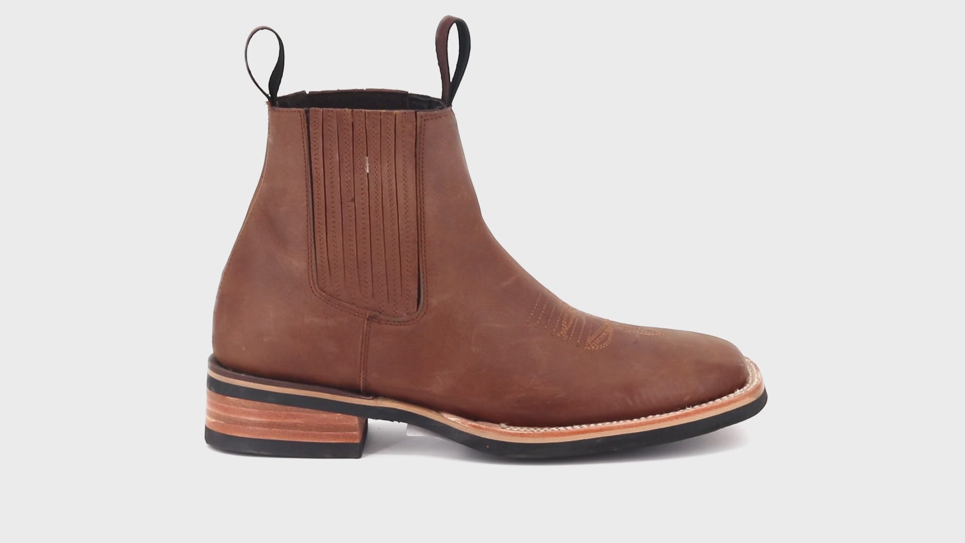 These men’s short western boots offer a relaxed, casual style with authentic western character. Crafted from genuine leather, they feature elastic side panels for flexibility and two leather pull straps at the top of the shaft for easy slip-on wear. Inside, the smooth leather lining provides comfort throughout the day. The square toe is accented with a subtle ringle detail, adding classic western flair, while the durable rubber sole delivers reliable grip and everyday stability. Comfortable, versatile, and effortlessly western—ideal for daily wear on or off the ranch.