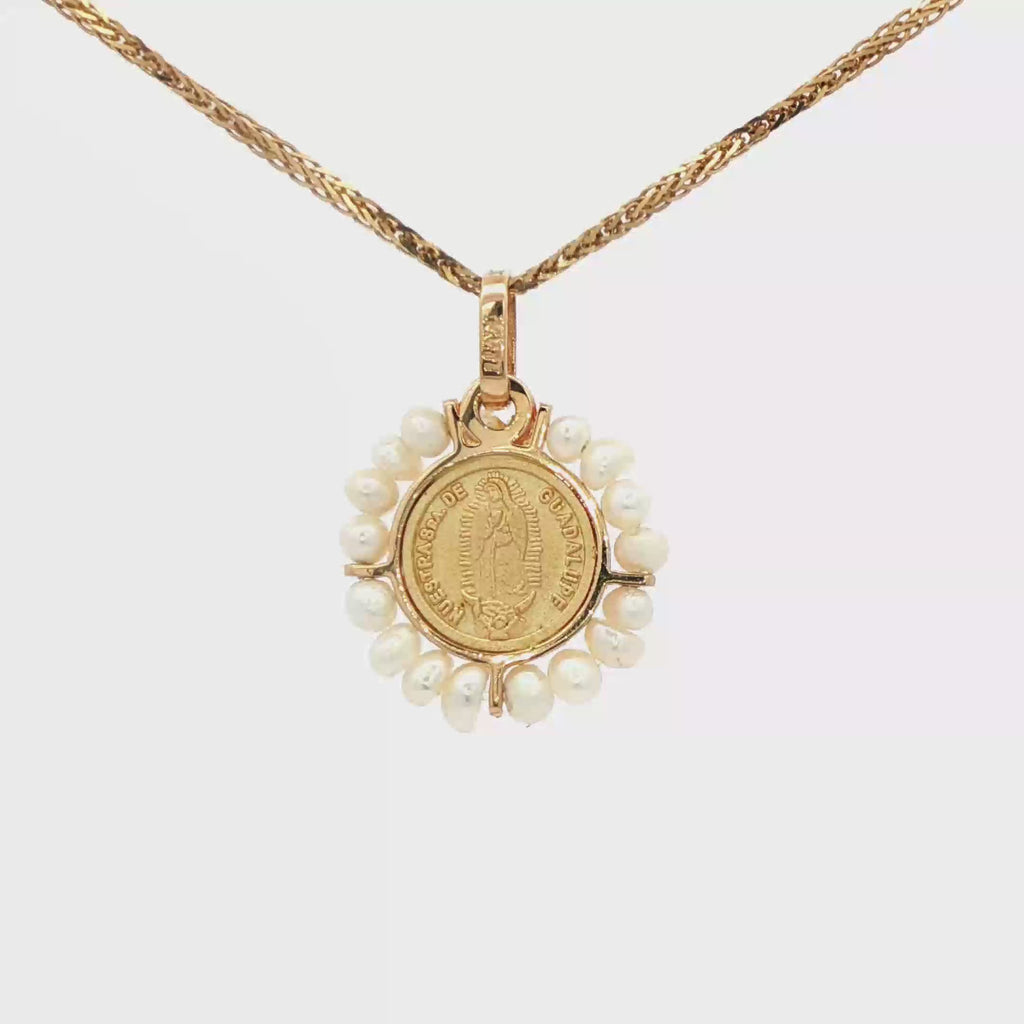 Este exquisito dije está cuidadosamente hecho a mano en brillante oro amarillo de 14 quilates y presenta una detallada imagen de la Virgen María en el centro. Alrededor, 16 perlas redondas y luminosas crean un halo elegante que realza su belleza sagrada y atemporal.