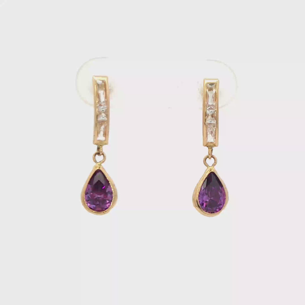Elevate your ensemble with these exquisite drop earrings, meticulously crafted in lustrous 14K yellow gold. Each earring features a captivating pear-shaped purple stone, beautifully accented with a rectangular-cut cubic zirconia that adds brilliance and contrast. Designed for both comfort and sophistication, these earrings include secure clasps, making them a timeless and refined addition to any jewelry collection.